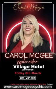 An evening of mediumship with one of the UK’s top mediums. Carol McGee has a unique sense of humor. Tears & laughter are always on the cards. Join us as this gifted medium connects you with those loved ones who have passed over.