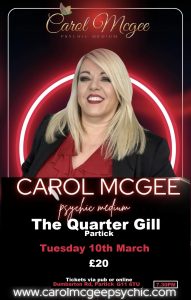 An evening of mediumship with one of the UK’s top mediums. Carol McGee has a unique sense of humor. Tears & laughter are always on the cards. Join us as this gifted medium connects you with those loved ones who have passed over.